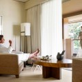 Просторный номер, выполненный современном островном стиле. В оформлении интерьера использованы натуральные материалы: тиковая древесина, махагон, натуральный камень и кожа.