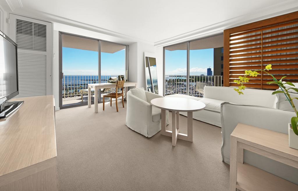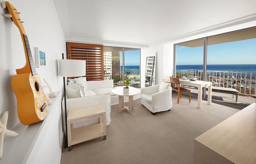Этажами выше, из стильных и светлых номеров отеля открывается потрясающий вид на бухту, океан и город.