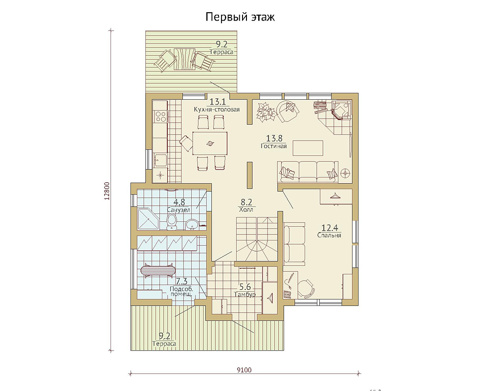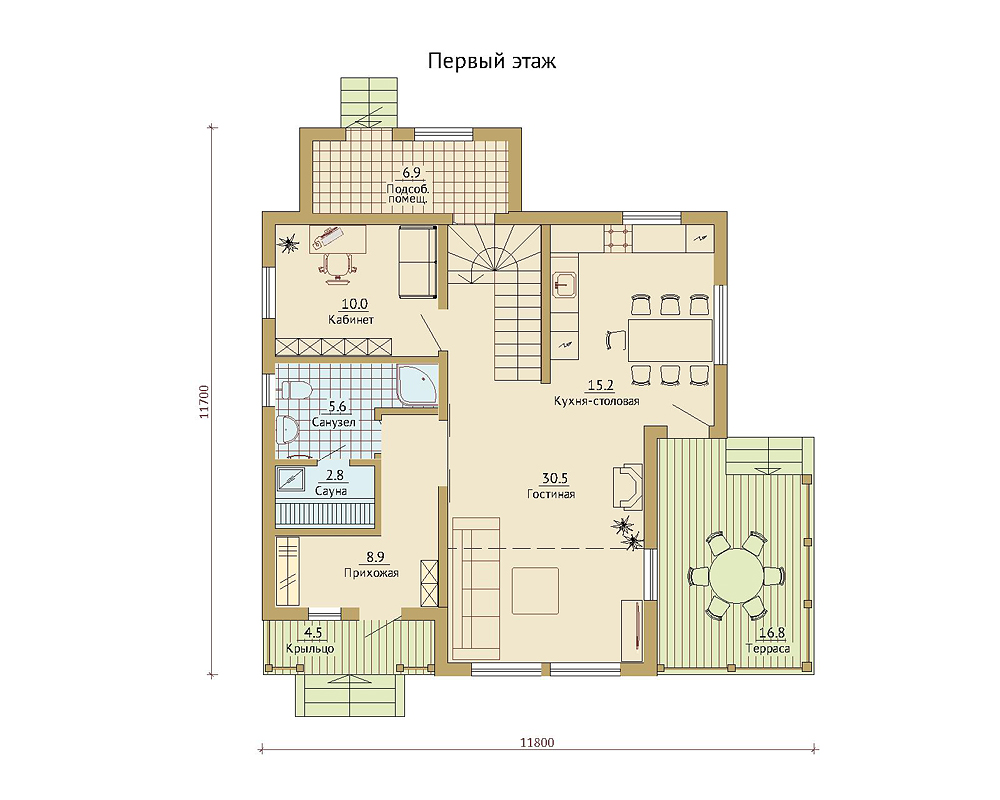 • Просторное подсобное помещение и тамбур, которое можно обустроить в качестве котельной и прачечной